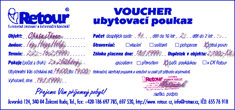 (Voucher) - 2 Stück zu. Das original ist für Sie und die Kopie geben Sie bei der Ankunft dem Quartiermacher ab. Auf dem Voucher sind angeführt: Quartiermacher, Ihr Name, Termin, Personenanzahl, Art und Anzahl der Zimmer, Höhe der Anzahlung und Datum der Überweisung, Höhe der Summe zur Vergütung und die bestellten Dienstleistungen.